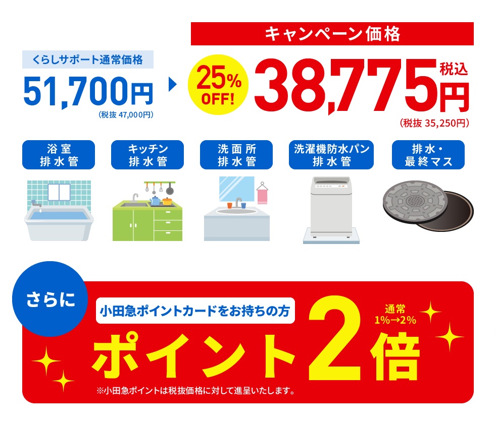 ・浴室、キッチン、洗面所、洗濯機防水パンの各排水管の施工はそれぞれ1箇所料金に含まれています。